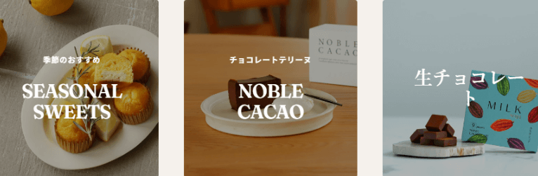 チョコレートミルクプリン、ニブトフィーチョコレート、クッキーなど個性的なチョコレート菓子がラインナップ。