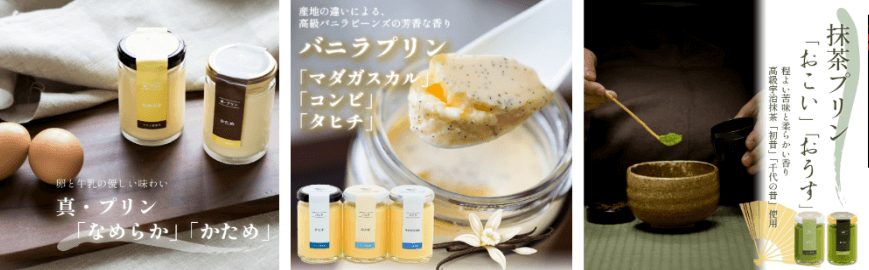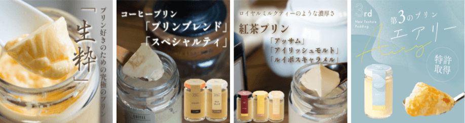 真・プリンのほか、バニラプリン、抹茶プリン、生粋プリン、コーヒープリン、紅茶プリン、第3のプリンエアリーなど素材の織りなすやさしい味わいのプリンが揃っています。